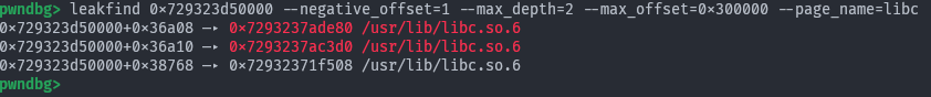 Finding leak chains can be done using the leakfind and probeleak commands. They recursively inspect address ranges for pointers, and report on all pointers found.
