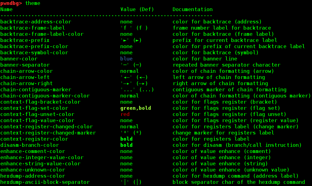 Pwndbg has a great deal of useful features. You can a list of all available commands at any time by typing the pwndbg command. Here's a small subset which are easy to capture in screenshots.