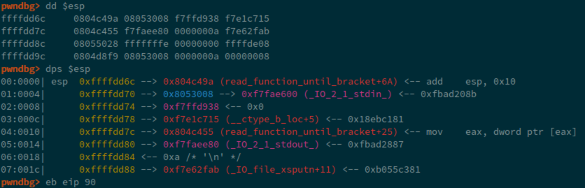 Inspecting memory dumps is easy with the telescope command. It recursively dereferences a range of memory, letting you see everything at once. As an added bonus, Pwndbg checks all of the available registers to see if they point into the memory range.