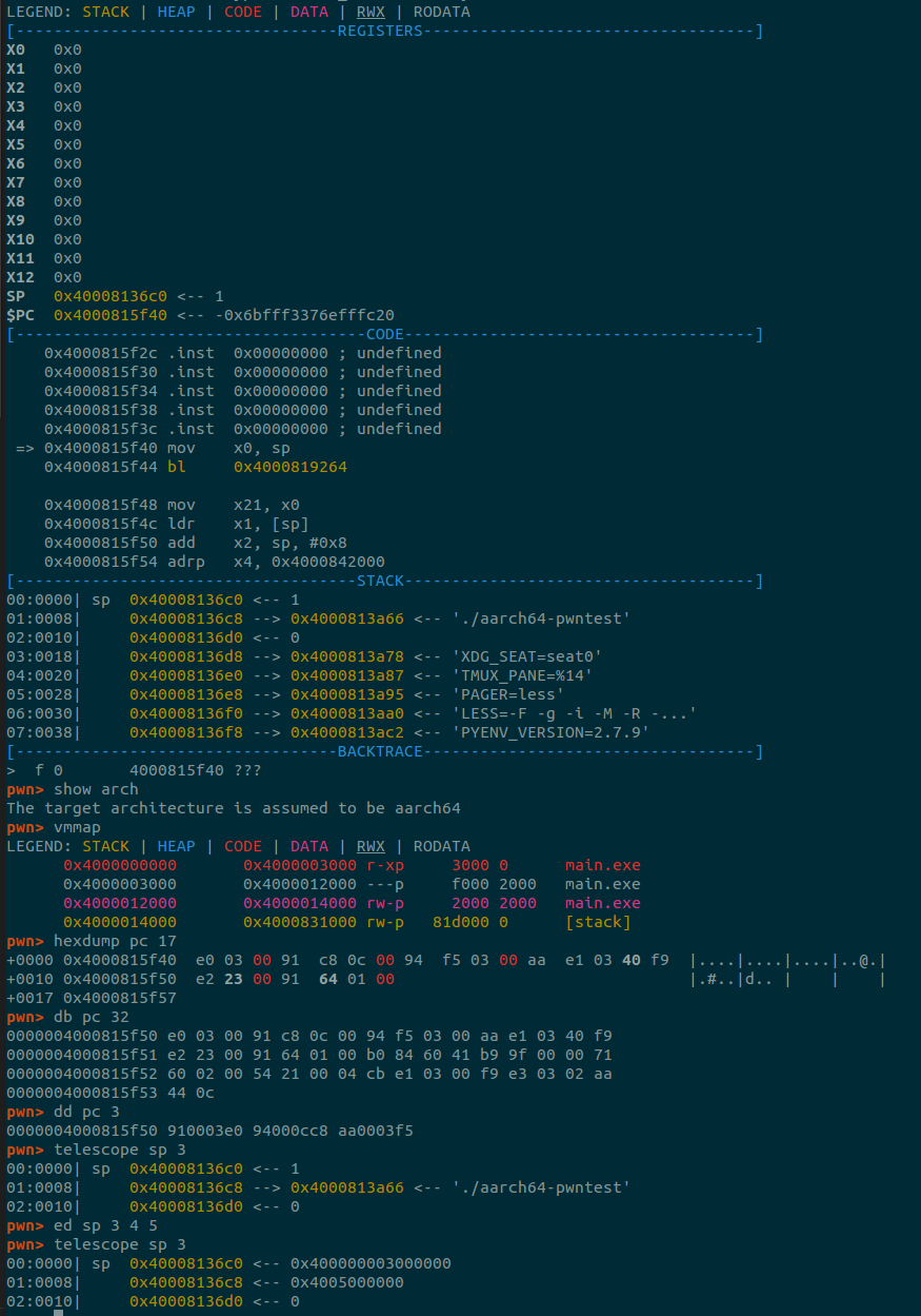 Here's a screenshot of pwndbg working on an aarch64 binary running under qemu-user.