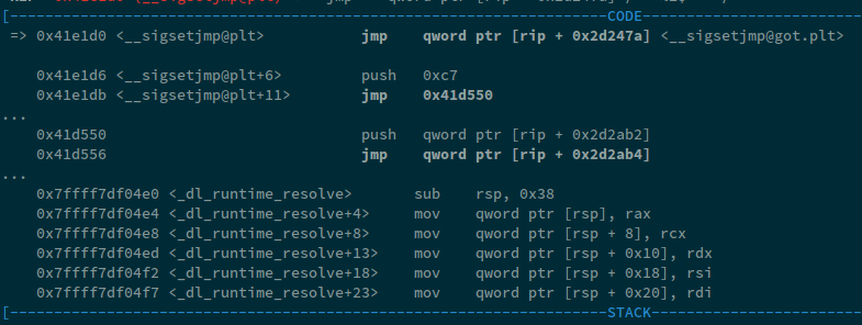 Here's a screenshot of PEDA. That it's aarch64 doesn't matter -- it chokes in the same way for everything qemu-user.